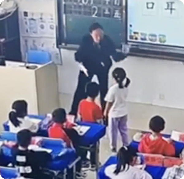 紧接着,一名白衣小女孩也走上前来交作业,却未料到老师也对她动了手,一记响亮的耳光后,作业被随手扔在地上。两个孩子默默捡起作业,黯然回到座位上,这一幕让人痛心不已。