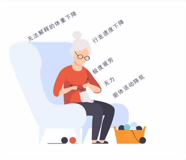 医学定义:衰弱是一种以体力下降、易疲劳、活动减少、体重减轻、认知变慢为主要表现的"老年综合征"。