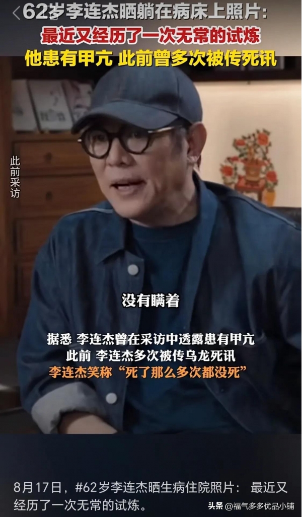 照片里的他穿着病号服,虽然脸上带着淡淡的微笑,但能看出气色确实不如从前,背景里的输液管和监护仪也让不少网友揪起了心。评论区里,短短半小时就挤满了祝福,有人说"杰哥一定要好好休息",也有人感慨"时光过得真快,当年的功夫巨星也该放慢脚步了"。