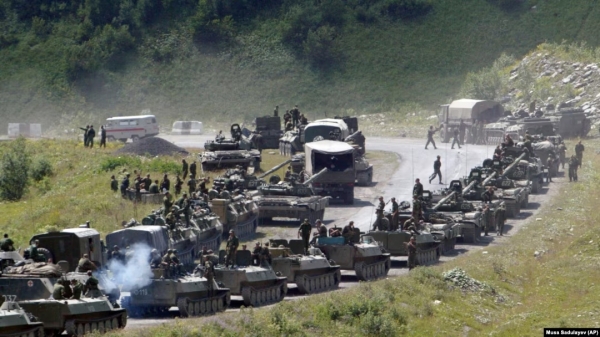 2008年8月7日,正向南奥塞梯首府茨欣瓦利开进的俄军装甲纵队 资料图