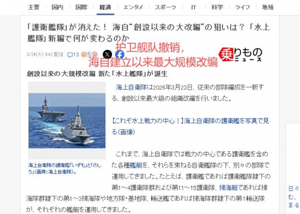 2026年3月23日,日本海上自卫队突然颁布命令,进行编制大撤改,废除了存续超过60年的"护卫舰队"编制,转而成立"水上战队"。这是海自历史上规模最大、最彻底的一次组织架构重塑。