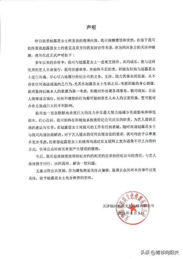 这两天赵露思跟经纪公司银河酷娱的解约风波闹得是沸沸扬扬,8月2日赵露思率先发文指控经纪公司未经她同意擅自划走她工作室账上205万,并且在她生病以后推诿不负责任,耗时间逼迫她。