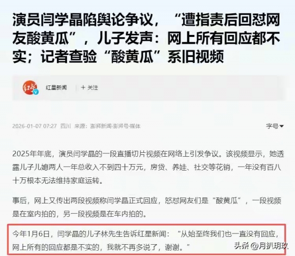 事件在2026年1月6日迎来了戏剧性反转。闫学晶的儿子林傲霏首次对外发声,直接给所有"网传回应"泼了一盆冷水。