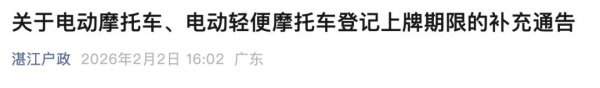 广东湛江等地明确规定,2026年3月31日为电动自行车、电动摩托车、电动轻便摩托车集中登记上牌的最后期限。