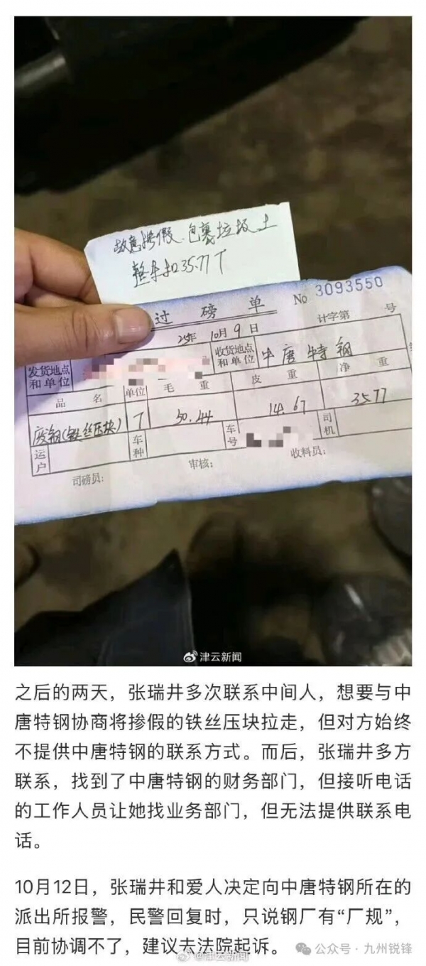"10月7日,我派车去济宁拉货,10月9日晚上,废铁丝压块被运到了中唐特钢。"张瑞井表示,与她接触的多数钢厂不同,中唐特钢采取的是先卸货再验货的流程。