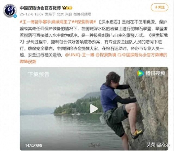 12月6日,针对演员王一博在户外综艺《探索新境2》北美录制期间"徒手攀岩失手坠海"的热议片段,中国探险协会出面进行了专业科普,也让不少网友放下了悬着的心。