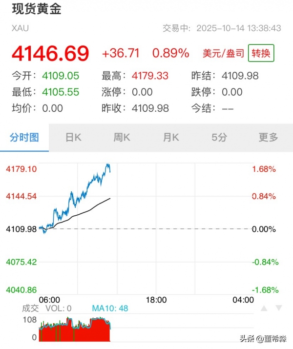 与此同时,国际金价同样势如破竹,现货黄金站上4100美元/盎司,最高4179.33美元/盎司,续刷历史新高。下一个目标位指向42000美元甚至4500美元。据业内人士统计,若金价能维系当前的上涨速度,最早到2028年便有望触摸到10000美元大关的门槛。