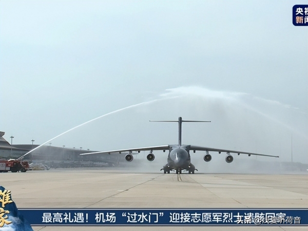 专机缓缓降落在沈阳桃仙国际机场时,机场以航空界最高礼仪 **"过水门"** 迎接英烈。两辆消防车喷射出巨大水柱,在半空交汇成晶莹的水门,如同为英雄洗去征程风尘、净化异国风霜。水雾弥漫间,覆盖国旗的英烈棺椁在礼兵庄重护卫下,平稳移出机舱,每一步都承载着祖国的尊崇与人民的思念。