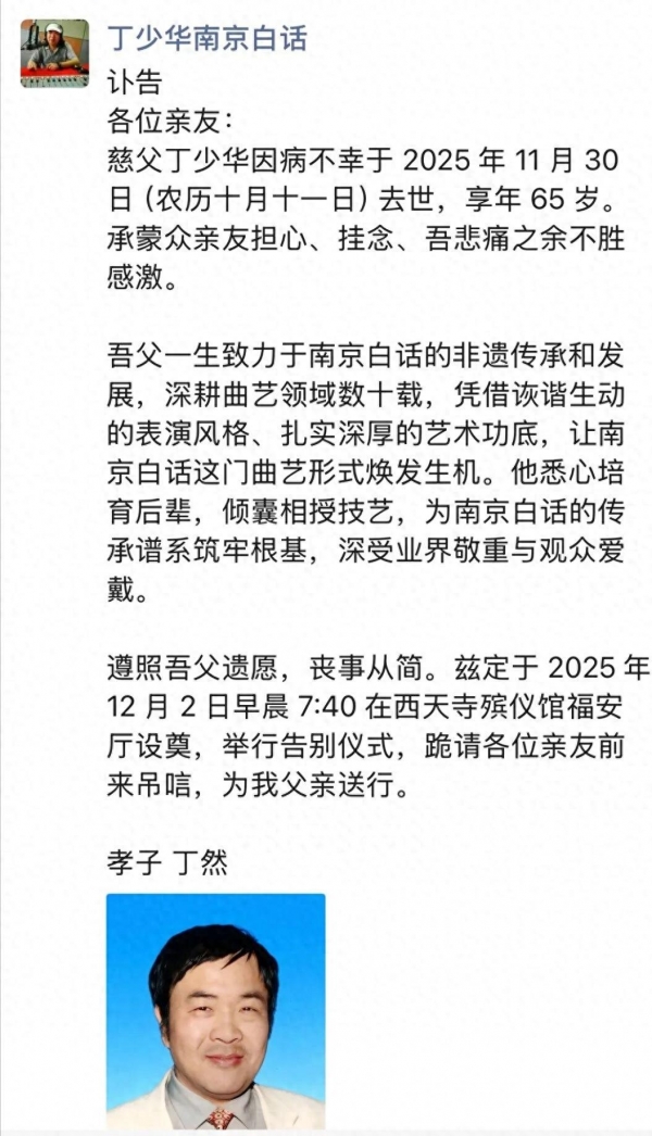 丁少华于2025年11月30日因病去世,享年65岁,其子丁然通过朋友圈发布讣告,并详细说明了丧事安排及贡献。