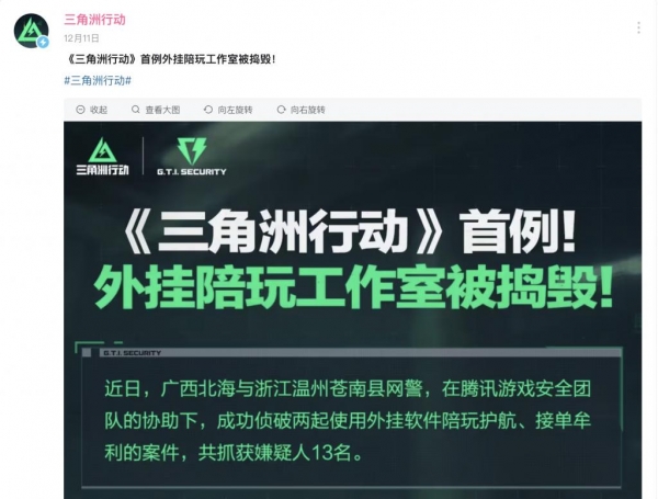 12 月 11 日,《三角洲行动》公告称,近日腾讯游戏安全团队协助广西北海与浙江温州苍南县网警,成功侦破两起使用外挂软件陪玩护航、接单牟利的案件,共抓获嫌疑人 13 名。这也是《三角洲行动》首例捣毁外挂陪玩工作室的案件。