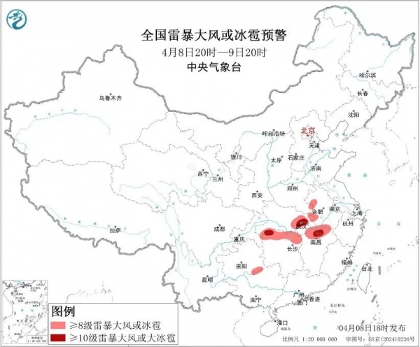 江汉、江淮西部、江南北部等地的部分地方,会有8级以上的雷暴大风,还有可能下冰雹。