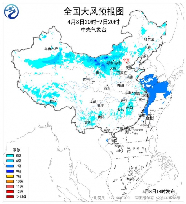 中央气象台4月8日下午6点,继续发布了三个预警:暴雨蓝色预警、强对流天气黄色预警、大风蓝色预警。