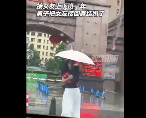视频中,男子记录接女友上下班一年后把女友接回家结婚了,当事人刘先生:记录的时候我想的就是结婚以后剪辑起来,我每天接她上下班,开车从我家到她家要40分钟,她那会不知道我记录她,她看完视频很感动.