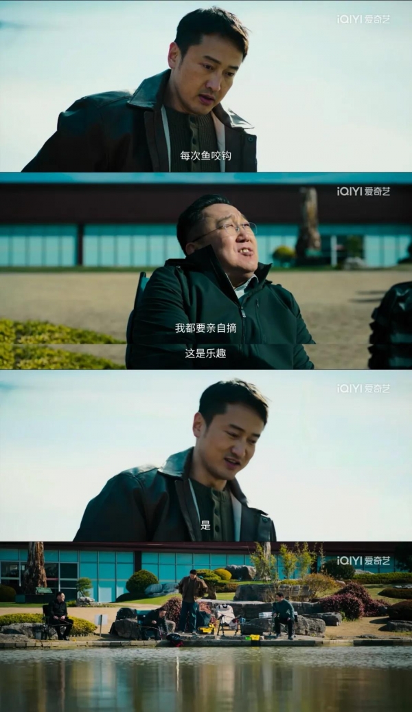 刘天也为了从乔德福(句号 饰)手里拿到诚建集团合同,通过开发区管委会主任的搭桥,终于组成了一场钓鱼局。在塘边,乔德福惜字如金,看似句句都在说钓鱼的事,实则条条都是对刘天也的警告和暗示。刘天也同样没让一句话掉地上。最后,和主任对眼神的确认细节,更是有着"点到为止"的微妙感。