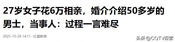 "花6万元找对象?"27 岁女子满怀期待花重金找婚介寻良缘,没想到对方推荐的相亲对象竟都是 50 多岁的男士,巨大年龄差让她当场懵圈,后续沟通更是 "一言难尽"。不少网友看完直呼离谱:"年龄差这么大,婚介是认真的吗?"