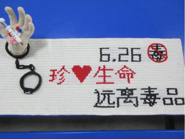 6月下旬的一天,监狱一处习艺场所,近百名服刑人员正在进行电脑键盘组装,少数从事钩针。冯舟是钩针班班长,他走上前,从一堆纸箱中翻出长近一米、宽约四十厘米的白底钩针作品,特意指出左上角一副黑色"手铐",被铐住的是一只拿着毒品的"手",它们都是以钩针形式完成。
