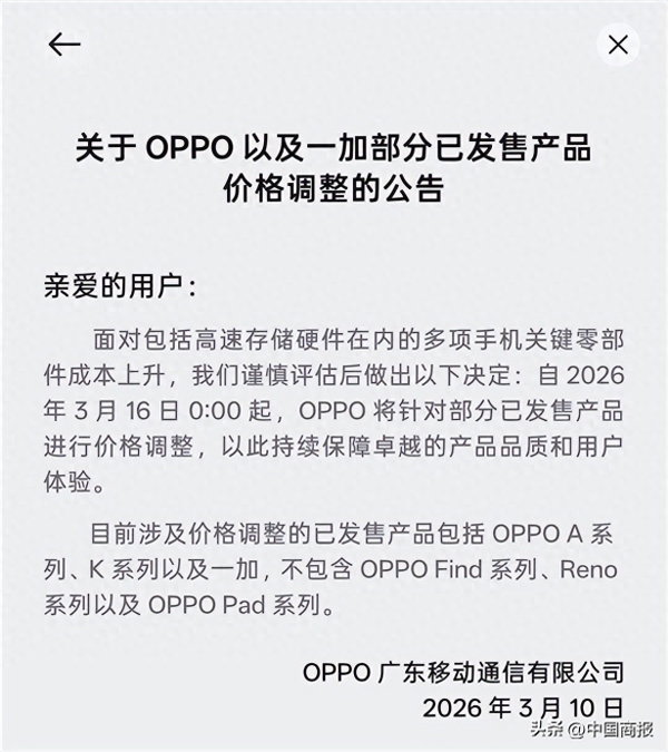 3月10日,OPPO在其官方商城发布公告,预告部分产品将于3月16日调整价格。目前涉及价格调整的已发售产品包括 OPPO A系列、K系列以及一加,不包含OPPO Find系列、Reno系列以及OPPO Pad系列。