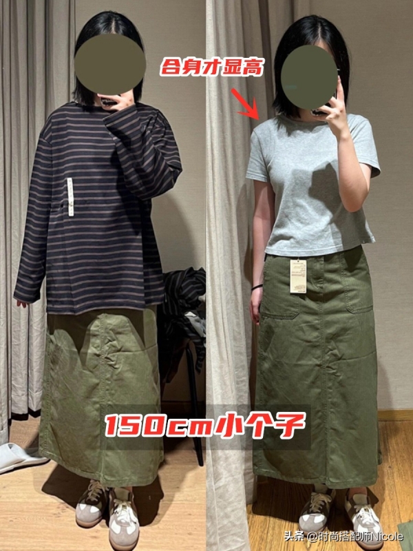 所以,别以为宽松就能遮百丑!没有腰线、没有轮廓的真·宽松,只会让你看起来更臃肿、更没比例,尤其是小个子女生,直接变成"行走的圆规"。▼▼