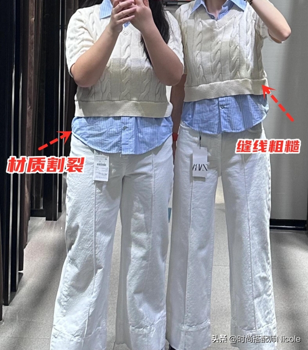 本意是为了更有层次感而设计的假两件,但是逼真的假两件太难买到了,市面上大多数的拼接部分材质通常较差,材质割裂感强,连接部位缝线粗糙甚至变形,甚至出现"假领子""假袖子"露馅的情况,显得廉价又刻意。▲▲