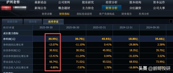泸州老窖的业绩略微比机构的预期要好,第三季度收入下滑9.8%,利润下滑13%,我记得机构预计的是20%的下滑。