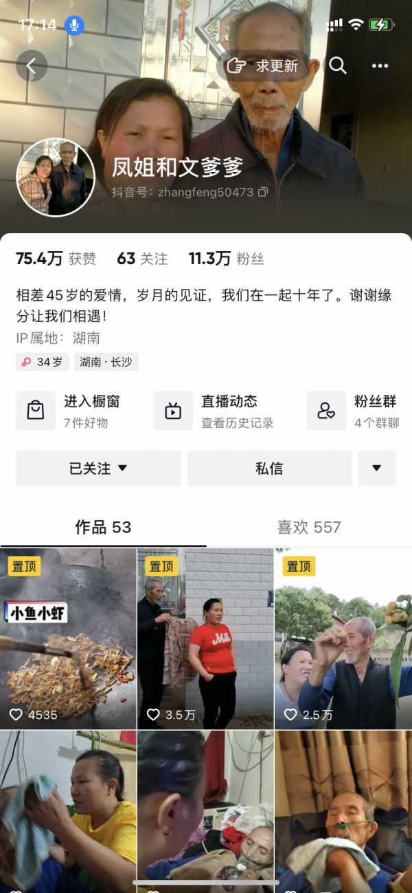 刚开始两人只是发一些日常的生活视频,看起来温馨又甜蜜,再后来随着年龄的增长,文长林的身体也越来越差,视频中更多的是张凤照顾文长林的视频。