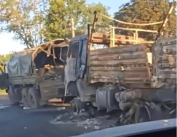 (被乌军袭击的俄军摩托化部队车队,很显然大批俄军士兵直接被打死在卡车里)
