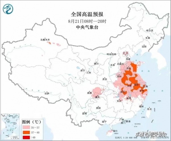 全国高温预报图(8月21日08时-20时)