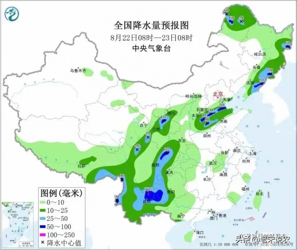 到明天,8月22日08时至23日08时,全国的降雨有所缩小或减弱,不过,西南和东北局部仍有强降雨天气,具体中到大雨落雨区主要集中分布在,内蒙古东北部、黑龙江西北部和东部、吉林东南部、辽宁东部、甘肃南部、宁夏中南部华北中南部、西南地区大部等地部分地区,而其中在内蒙古东北部、黑龙江东北部、吉林东南部、辽宁东部、宁夏中部、山西中南部、河北中南部、四川盆地西北部、贵州西南部、云南中部和东北部等地部分地区还有暴雨,局地大暴雨,其累计降雨量可达100~160毫米。