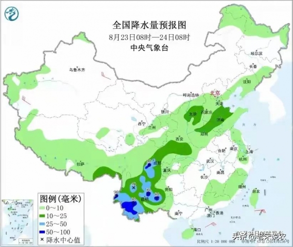 再到后天,8月23日08时至24日08时,北方本轮强降雨基本结束了,而西南和中部地区部分地区仍有强降雨天气光临。具体中到大雨落雨区主要集中分布在,山西中部、黄淮东部、西南地区大部等地部分地区,而其中在四川盆地西南部、云南西南部和中部等地部分地区还有暴雨(50~90毫米)。