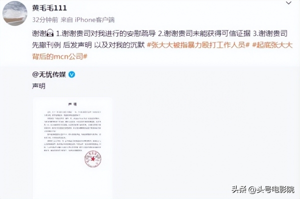 之后,网友黄毛毛转发无忧传媒的声明,表示: