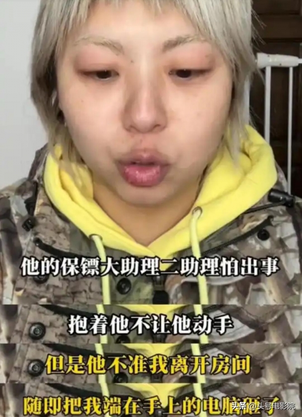 对方用枕头砸,后来还用茶几和玻璃杯砸,下手越来越重。后面张大大的保镖和助理才出来阻止,但张大大不准黄毛毛离开房间,还砸了她的电脑。