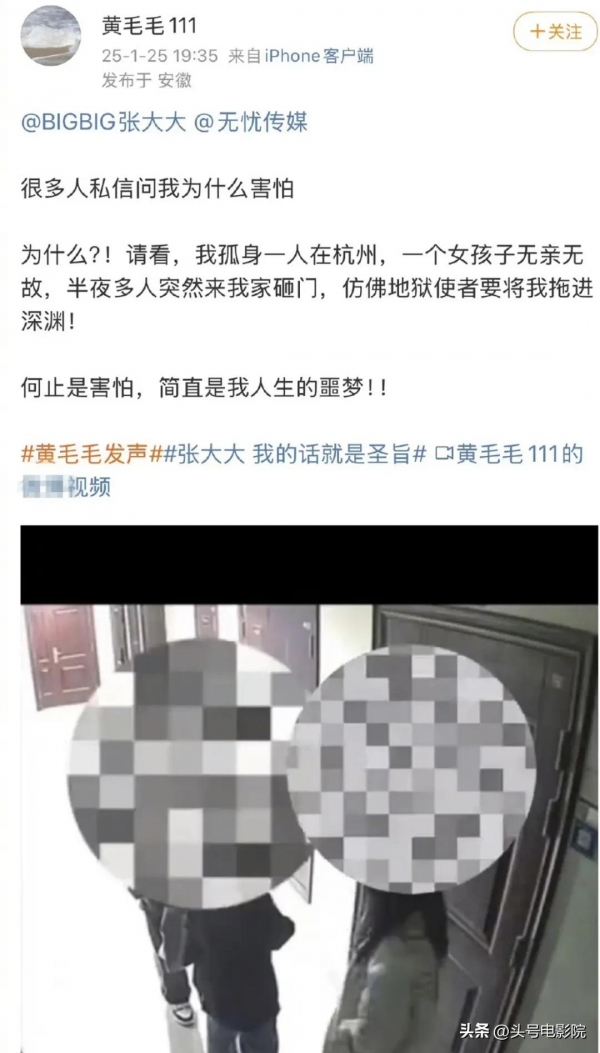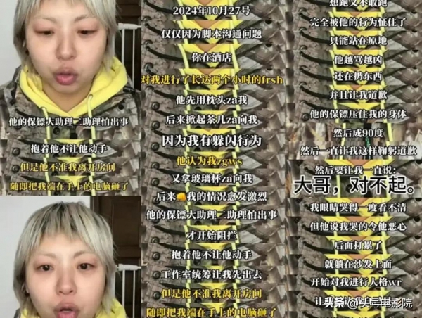 网友黄毛毛自称,2024年10月27日,因为剧本沟通有问题,张大大不高兴了,对她进行长达两个小时的伤害。
