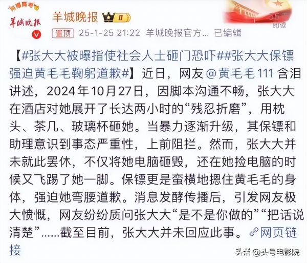 同时,就连媒体也随之跟进,点名报道#张大大被曝指使社会人士砸门恐吓##张大大保镖强迫黄毛毛鞠躬道歉#。