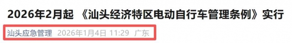 《汕头经济特区电动自行车管理条例》修订版将于2026年2月1日起正式实施。该条例规定了电动自行车的生产、销售、登记、通行、停放和充电的各项要求,如果违反将被处以罚款。