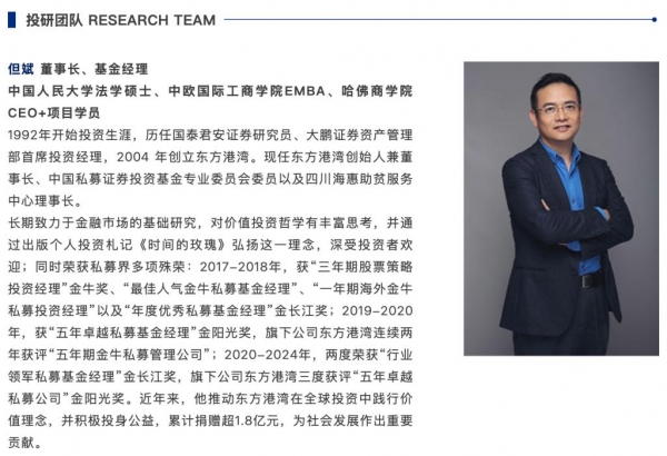 深圳东方港湾投资管理股份有限公司成立于2004年3月,是国内最早成立的私募基金公司之一。澎湃新闻记者查阅东方港湾官网信息发现,但斌为该公司董事长、基金经理。作为东方港湾的创始人,但斌倡导价值投资,著有《时间的玫瑰》,更为大众熟知的是贵州茅台"铁粉"的身份。