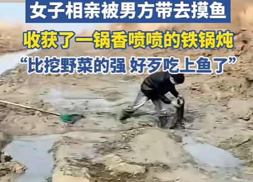 "比挖野菜的强,好歹吃上鱼了!"近日,安徽,一女子去相亲,男方没有带她去餐厅吃饭,也没去看电影,而是直接带女子去郊外,体验了一把摸鱼的快乐,最后收获颇丰,男方还用两人一起摸的鱼,给女子做了一大锅铁锅炖!网友:"这个相亲方式也太香了!"