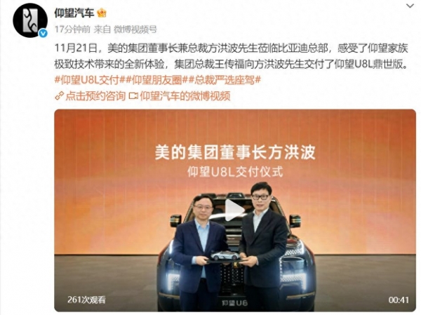 11月24日,仰望汽车官方微博发布信息称,美的集团董事长兼总裁方洪波成为仰望U8L鼎世版车主,比亚迪董事长兼总裁王传福现场交车。