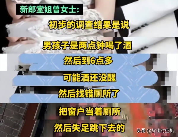 目前,警方的初步勘察认为新郎是酒醉后出来上厕所,误把窗户当成了厕所门,失足坠楼。