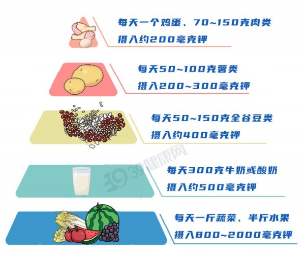 要想轻松达标,关键就得看怎么吃。我们可以参考中国疾病预防控制中心营养与健康所推荐的补钾"金字塔",把钾科学地分配到一日三餐,尤其是晚餐里↓