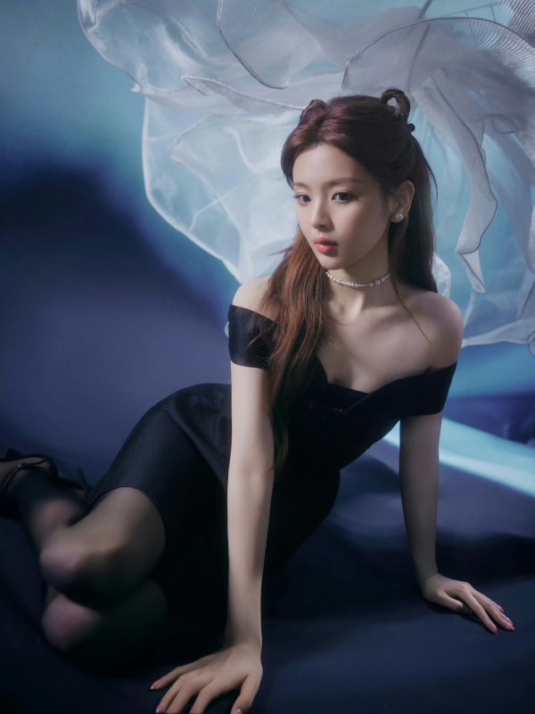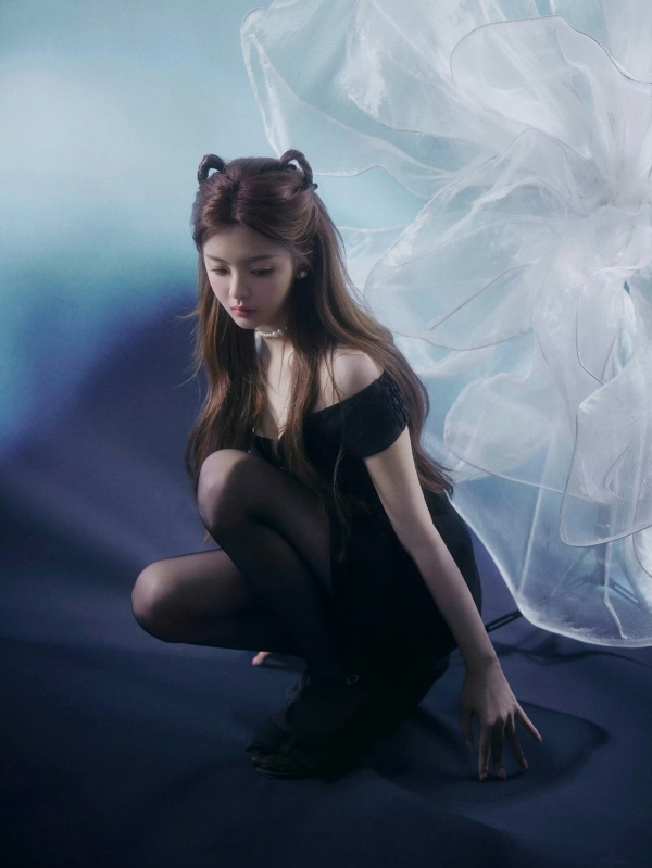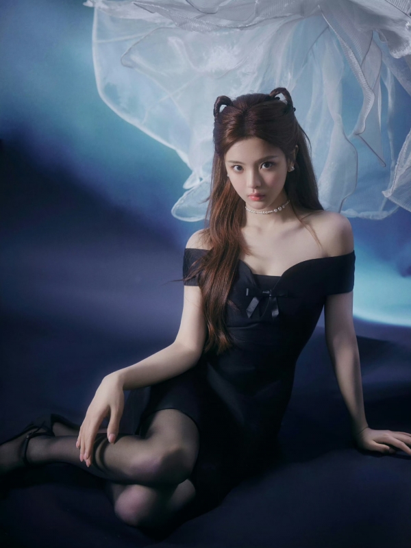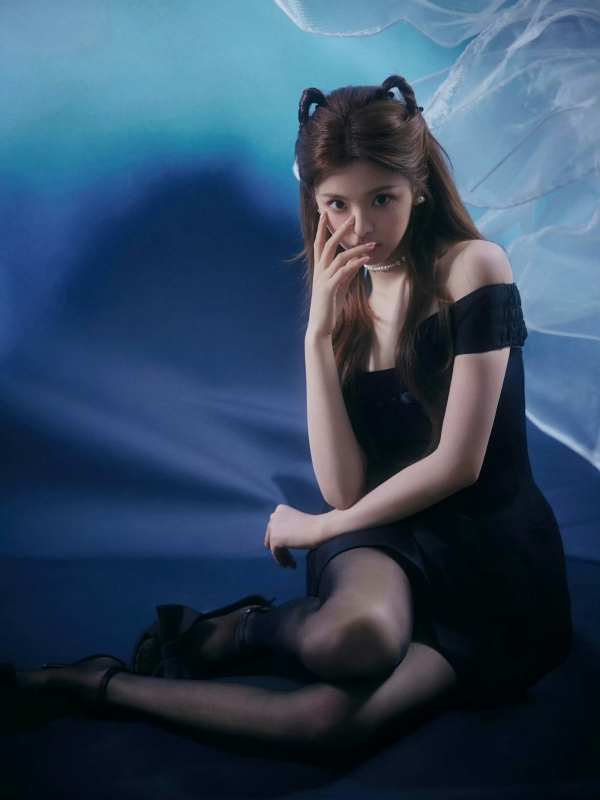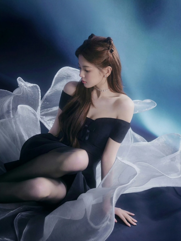 背景也踩中了审美点:冷调蓝衬得黑裙更显质感,飘起来的纱幔裹着软乎乎的光,把她的肩颈线、细腿衬得又纯又欲--这哪是写真,明明是"甜欲教科书"!