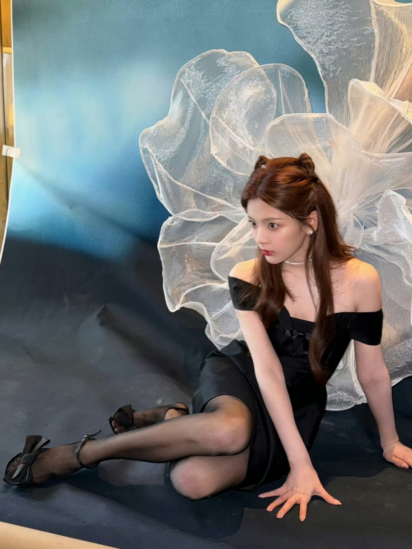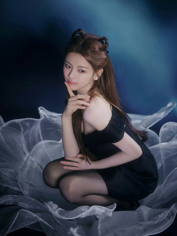 光看这发型就赢麻了:头顶挽两个软乎乎的小揪,碎发垂在肩颈勾出慵懒感,配上她圆溜溜的眼型,直接嫩成刚放学的软糯学妹--谁能想到,这张"幼态甜妹脸",下一秒就被黑裙"杀"疯了?