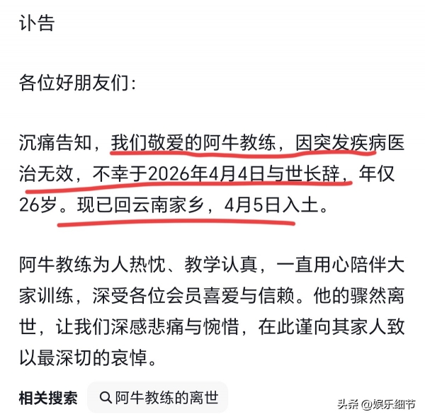 他的同事在网上发布讣告,讣告上称:"沉痛告知,我们敬爱的阿牛教练,因突发疾病医治无效,不幸于2026年4月4日与世长辞。"