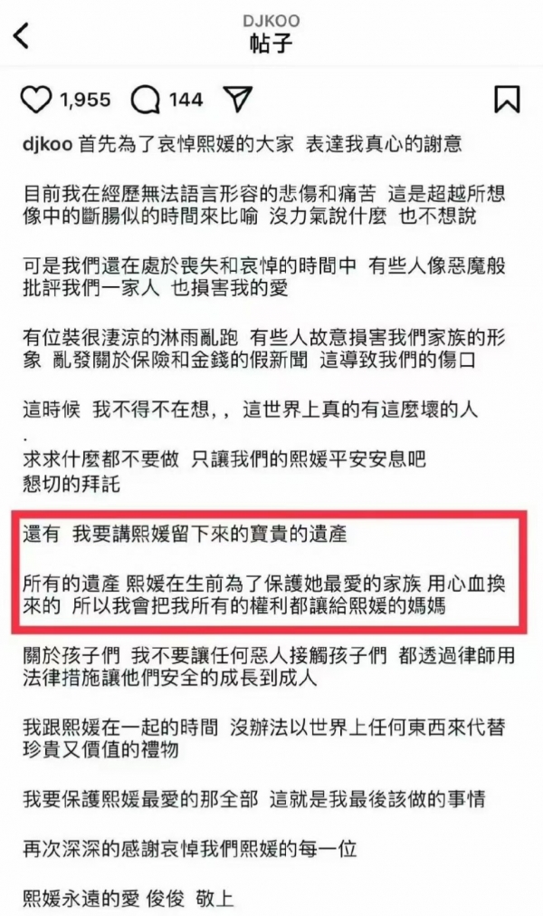 如今,据台媒透露,虽然网传具俊晔是大S遗产第一顺位继承人,不过大S出道以来,经济大权都交给S妈打理,结合具俊晔的声明来看,想必现在也是如此。