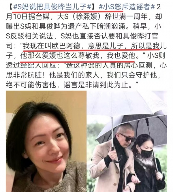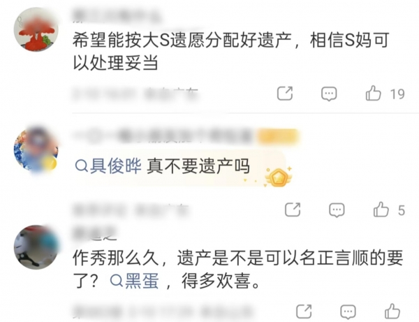 对于大S的遗产,网传具俊晔是第一顺位继承人,如果真是这样,有网友替S家抱不平,也有网友希望把遗产给两个小孩,更有人挑拨离间,认为具俊晔与S家不和,S家想要争夺遗产。