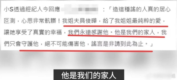 此外,小S也发声力挺姐夫具俊晔,否认谣言并怒斥造谣者,她说具俊晔是家人,S家会守护具俊晔,不会伤害他。