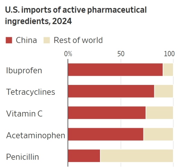 其三为医药行业。报道称,虽然美国药店或柜台上销售的药物通常不会标注"中国制造",但其原料药或生产原料药所需的前体化学品,往往由中国供应。