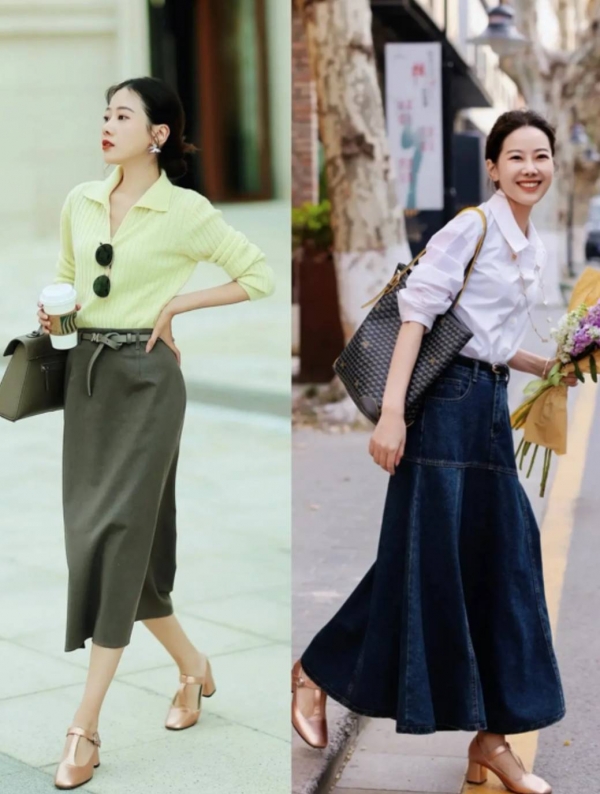 上短下长的搭配,很适合小个子女人,Polo领的针织衫和白衬衫,都可以塞进高腰半身长裙,在搭配上一双缎面玛丽珍鞋,高贵又优雅。