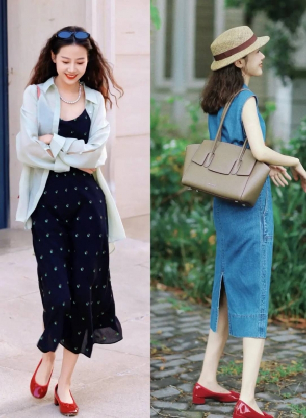 过膝款式的连衣裙,穿法是非常丰富的,无论是单穿还是叠穿都很有看点。面料硬挺一点的牛仔连衣裙更适合单穿,配小红鞋复古时髦;材质柔软轻薄的吊带裙,叠穿遮臀衬衫更有层次。