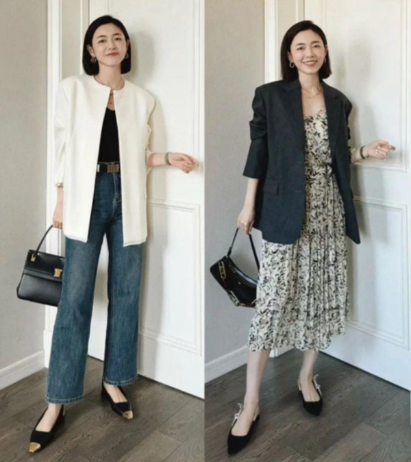 女人到了40岁以后,身材会发生很明显的变化,所以穿衣服也要学会扬长避短。搭配丝绸材质的连衣裙,可以叠穿遮臀西装;穿九分烟管裤的时候,内搭的上衣要修身一点。