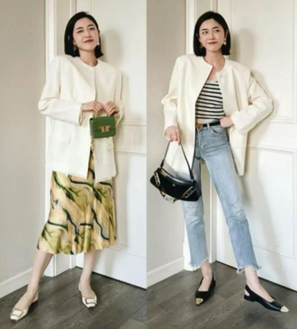 无论是穿裤还是穿裙,有一件遮臀外套进行加持,都会显得格外丰富,同时还能隐藏身材上的短板。硬挺有型的遮臀外套,配收腰裙或长裤,完全就不在话下。